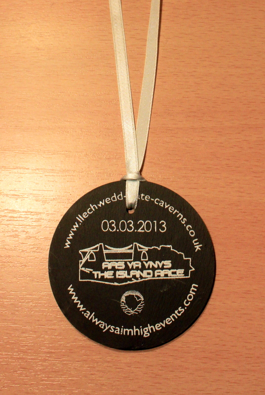 I the end I got a meal, a good sleep and a taxi to the race start where Matthew (the driver) agreed to keep my suitcase behind the tea stall and make sure it didn’t get nicked. It was another perfect day for racing, with the sun splitting the sky but a frost in the air. This video shows us all lining up at the Menai Bridge and heading out the coastal road to Beaumaris Castle. There was a really friendly camaraderie on the Island Race, with all the plodders chatting about the charities we were running for and what races we’d done before or had in mind for the year ahead. The there-and-back design of the route did mean that the eventual race winner passed me on his way back to the finish line as I approached mile 7, which was slightly demoralising, but we gave him a big cheer as he sprinted past and he gave us an encouraging applause in return. And the last mile was lined with earlier race finishers cheering on those still to finish. John had a cuppa ready for me after I’d received my medal and banana and headed over to the tea tent. It was a really friendly race. The medals for the Island Race are made from slate mined in the local area, which is a nice touch too.
